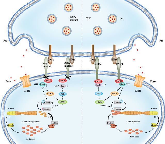本研究使用果蝇三龄幼虫的神经肌肉接头作为模型,揭示了DNlg2对突触形态与功能调控的重要作用。dnlg2突变后,突触后F-actin的组装显著减少,而与F-actin组装相关的重要分子Cofilin的磷酸化形式水平也显著降低。在突触后表达Cofilin能够挽救dnlg2突变体中F-actin组装减少的缺陷,以及一系列突触形态与功能的缺陷。进一步的研究发现,DNlg2胞内段能够与活化C激酶1的受体(RACK1)结合,并通过调控Rac1与RhoA的活性而实现对Cofilin活性的调节,从而调控F-actin的组装。由DNlg2-RACK1-Cofilin介导的F-actin组装,在突触的生长、突触后受体的募集、突触传递和幼虫运动中起着重要作用,该信号通路为相关精神类疾病的治疗提供了潜在的干预靶点。