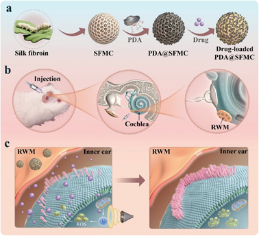职业环境中发生的噪声性听力损失(NIHL)是听力损伤的最常见原因之一,尤其是在工业化国家。在噪声暴露下,耳蜗中会产生过量的活性氧(ROS),而内源性抗氧化系统在清除 ROS 方面存在局限性。在这种情况下,外源性抗氧化剂可以在维持体内平衡方面发挥积极作用。然而,血迷路屏障阻碍了传统方法给药方式(全身给药和静脉注射等)的有效性。相比之下,通过圆窗膜(RWM)进行局部给药已成为一种首选策略,因此已开发出各种生物材料衍生的载体用于局部内耳递送,包括纳米颗粒、块状水凝胶、微胶囊和微粒。尽管取得了一定进展,但大多数此类载体结构简单,所装载药物的长期储存能力较差,且无法在目标位置长期停留,导致治疗结果不理想。此外,这些载体主要来源于合成聚合物,通常存在生物相容性差和生物降解不充分等问题。因此,仍然需要开发新型的内耳递送系统。
