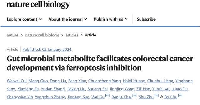 2024年1月2日,山东大学基础医公司初波教授团队,联合中国科学技术大学朱书教授,太阳成集团柴人杰教授和美国哥伦比亚大学顾伟教授在Nature Cell Biology在线发表了题为 Gut microbial metabolite facilitates colorectal cancer development via ferroptosis inhibition的研究成果。该研究首次揭示了厌氧消化链球菌P. anaerobius分解色氨酸产生吲哚-3-丙烯酸,通过抑制肿瘤铁死亡的发生促进结直肠癌的疾病进程,并明确解析其潜在的分子机制,为临床肿瘤铁死亡疗法的开发和应用提供了新的药物研究靶点和治疗策略。