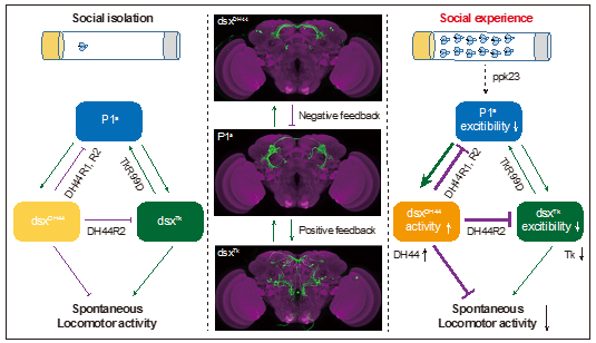 作者发现,dsxTk和dsxDH44神经元分别促进和抑制自发运动,而P1a神经元可在不同的兴奋强度时双向调节自发运动。一方面,P1a和dsxTk神经元形成功能正反馈,放大了该环路对外界刺激的响应,并产生一种延续性的效果;另一方面,P1a和dsxDH44神经元形成功能负反馈,一定程度上保持了该环路的稳定性。作者还发现,丰富的社交经验增强了dsxDH44神经元的本底活性,同时抑制了dsxTk和P1a的神经元可兴奋性。这些神经肽表达以及神经元功能上的改变共同调控了社交经验对自发运动的调节,使得社交隔离的雄蝇自发运动更多,而社交经验丰富的雄蝇自发运动更少。