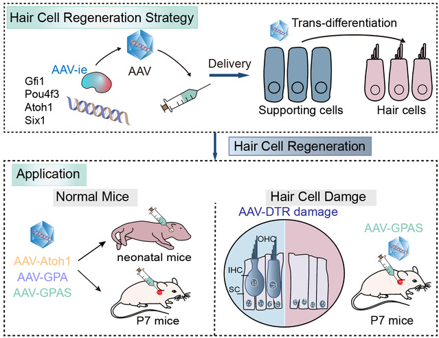 哺乳动物耳蜗毛细胞对听力至关重要,耳蜗毛细胞的损伤会导致严重的听力障碍。受损的毛细胞可以通过邻近的支持细胞再生,因此毛细胞的功能再生是体内听觉功能恢复的主要目标。现有研究表明,多基因协同调控是实现体内毛细胞功能再生的有效策略。然而,使用传统的方法(转基因小鼠)在耳蜗中实现这种协调存在挑战,如交配时间周期长,而AAV介导的多基因调控是完美的解决方案。