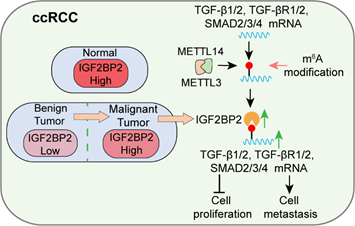 为了进一步阐明IGF2BP2在肾透明细胞癌中的分子机制,研究者利用高通量测序数据RNA-seq、RIP-seq和LACE-seq进行生物信息学分析,筛选出IGF2BP2的潜在下游靶标—TGF-β信号通路,通过检测TGF-β-SMAD信号通路的关键基因,研究者发现干扰IGF2BP2的表达可以显著降低TGF-β-SMAD信号通路靶基因集TGF-β1/2、TGF-βR1/2、SMAD2/3/4的表达水平,过表反之。随后,m6A-seq测序数据表明以上基因均有m6A修饰,研究者通过RNA结合蛋白免疫沉淀结合实验证实,TGF-β-SMAD信号通路靶基因集均有m6A富集且受m6A修饰的调控,IGF2BP2依赖于m6A修饰调控靶基因集的稳定性从而影响其表达水平。随后的体外和体内的挽救实验表明IGF2BP2在肾透明细胞癌中通过TGF-β-SMAD信号通路调控细胞的增殖和转移。综上所述,此项工作明确了IGF2BP2通过m6A修饰正调控TGF-β-SMAD信号通路且通过该通路发挥功能的具体分子机制(下图),为TGF-β-SMAD信号通路的表观转录后调控提供了新的理论基础,为TGF-β的靶向治疗提供新的理论参考。