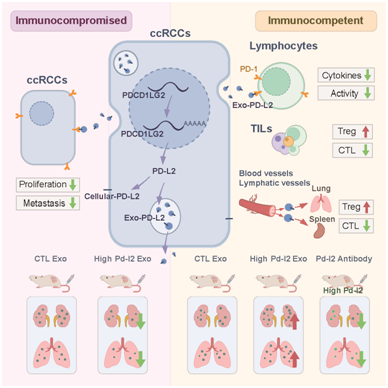 研究者在检测肾透明细胞癌患者PD-L2的组织表达时,意外发现肾透明细胞癌患者的PD-L2蛋白主要分布在细胞间隙而非传统研究认为的大部分定位于细胞膜上。于是在胞外的细胞外囊泡组分中探究PD-L2的分布比例,发现外泌体表面的PD-L2占最大比重。并且在多种癌症中肿瘤细胞来源的外泌体PD-L1(TDE-PD-L1)相比,肿瘤细胞来源的外泌体PD-L2(TDE-PD-L2)表现出更高的表达水平。在功能方面,在缺乏适应性免疫的情况下,TDE-PD-L2能够抑制肿瘤的生长和转移。然而,在免疫功能完善的条件下,TDE-PD-L2通过PD-1依赖性机制与免疫细胞结合,从而通过增加调节性T细胞的比例和降低细胞毒性CD8+ T细胞的比例,系统性地削弱肿瘤浸润的T细胞和外周免疫器官脾脏中T细胞的功能,进而促进肿瘤的生长与转移。同时,使用针对PD-L2的抗体治疗能够有效挽救TDE-PD-L2对肿瘤的促进作用。