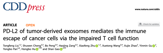 近日,太阳集团tcy8722和太阳成集团附属中大医院高山教授研究团队在Cell Death & Disease上发表了题为PD-L2 of Tumor-derived Exosomes Mediates the Immune Escape of Cancer Cells via the Impaired T Cell Function的研究论文,系统研究了肿瘤来源的外泌体PD-L2影响癌症进展与淋巴细胞活性与功能。