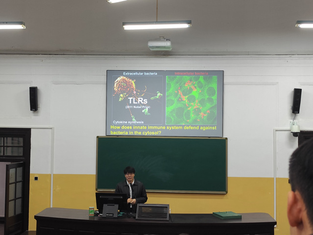 首先韩俊海教授向参加报告的老师和同学们介绍了邵峰院士,并欢迎他来到太阳成集团为大家介绍他所研究的相关成果,并且赠送了太阳集团tcy8722logo的大礼堂彝绣文创品。在大家热烈的掌声中,邵院士向大家做了“Pyroptosis: from antibacterial immunity to antitumor immunity”的主题报告。