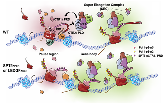 然而,作为进化上高度保守的转录暂停/延伸因子,SPT5在转录早期延伸过程中的角色转变机制尚不明确。晶状体上皮源性生长因子(LEDGF/p75),是一种染色质相关蛋白,包含甲基赖氨酸阅读结构域(PWWP)和整合酶结合结构域(IBD),在转录调节和DNA修复中扮演重要角色,其异常与多种人类疾病相关,包括艾滋病、癌症和自身免疫。本研究首次揭示了LEDGF/p75在转录暂停与延伸之间切换中的关键作用。研究表明,LEDGF/p75通过阻止SEC对SPT5的磷酸化,抑制Pol II从启动子近端暂停状态转变为延伸状态。进一步分析发现,SPT5的羧基末端重复序列(CTR)中的两个相邻结构域——磷酸化位点富集结构域(PRD)/CTR1和朊病毒样结构域(PLD)/CTR2——在转录延伸和暂停过程中发挥着独特的作用。LEDGF/p75通过与SPT5的PLD结构域结合,阻止SEC对SPT5-PRD的磷酸化,从而维持转录暂停状态。此外,LEDGF的IBD结构域能降低SEC在启动子近端的结合效率,并进一步抑制SPT5的磷酸化,防止Pol II从暂停状态释放进入延伸阶段。总之,本研究揭示了LEDGF/p75与SEC如何通过协同作用调控SPT5,确保转录从暂停到延伸的顺利过渡。该研究为转录暂停与延伸之间的切换提供了新的调控机制视角,具有重要的生物学意义。