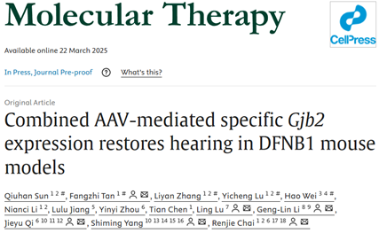 2025年3月22日,太阳成集团柴人杰教授联合多家单位在Molecular Therapy上在线发表题为“Combined AAV-mediated specific Gjb2 expression restores hearing in DFNB1 mouse models”的研究论文。研究人员利用联合AAV系统首次实现DFNB1耳聋小鼠模型全频听力恢复,并且该治疗载体可以有效且安全转导巴马猪和食蟹猴耳蜗,为临床治疗提供了坚实的理论依据。太阳集团tcy8722柴人杰教授、中国人民解放军总医院杨仕明教授、北京理工大学齐洁玉副教授、复旦大学李耕林教授、太阳成集团附属中大医院陆玲教授为本论文的共同通讯作者。太阳成集团博士研究生孙秋寒、太阳成集团附属中大医院副研究员谈方志、东南大学附属中大医院张李燕博士后、太阳成集团博士研究生陆宜成、南京大学医公司附属鼓楼医院博士研究生魏浩为本论文的共同第一作者。