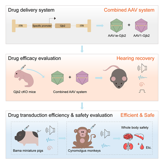 耳聋是临床上最常见的致残性疾病,已经严重影响了人类的正常生活,给社会造成了巨大的负担。据WHO报道,全球约有15亿人存在不同程度的听力损失,4.66亿人患残疾性听力损失,占总人口的5%,其中儿童占3400万。由遗传因素导致的耳聋约占60%。Gjb2基因编码缝隙连接蛋白26(Cx26),是非综合征型听力损失(Non-syndromic hearing loss,NSHL)中最常见的致病基因,在常染色体隐性遗传的耳聋患者中,约有50%的患者为Gjb2基因突变引起,Gjb2基因的不同突变可导致常染色体隐性1型耳聋(DFNB1),目前临床上缺乏有效的根治方法。腺相关病毒(Adeno-associated virus,AAV)介导的基因治疗在恢复因OTOF基因突变引起的遗传性耳聋患者听力中展现了优秀的安全性和有效性。因此,亟需开发靶向Gjb2的基因疗法。然而,受限于无高效且特异靶向Gjb2表达细胞的AAV载体,Gjb2的基因疗法研究进展缓慢。