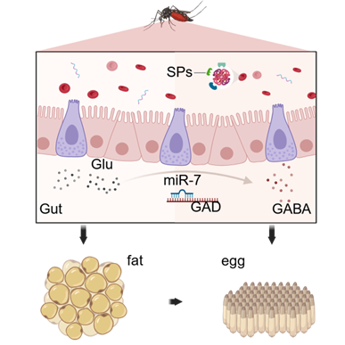 该研究揭示了一种重要的miRNA介导机制。研究证明了miR-7调节中肠GABA的水平,从而维持肠道内稳态。小RNA 测序确定了miR-7是一种对血餐消化动力学敏感的关键调节分子。从机制上讲,miR-7直接靶向谷氨酸脱羧酶,以调节中肠中谷氨酸-GABA的代谢平衡。与此同时,雌性蚊子表现出中肠蛋白酶活性受损、脂肪体脂质储存紊乱以及繁殖力下降。这项研究描绘了一个分层调节框架,其中miR-7-GABA调节血餐消化效率,并最终决定生殖适应性。研究确定了一种通过调控消化影响生殖产出的重要miRNA,为阻断虫媒病毒传播的干预措施提供了关键靶点。