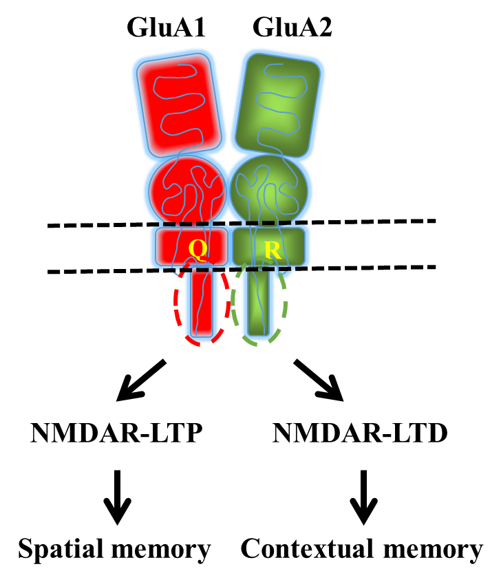 以往该领域内的海量研究大都采用了体外组织或细胞培养、干扰小肽、转染或病毒介导的外源蛋白表达等技术手段。但基于上述研究方式研究所得出结论是否能适用于内源性AMPA受体一直存疑。此外,先前报道的若干AMPA受体亚基敲除小鼠品系由于其基础水平的运动能力有缺陷,无法进行学习与记忆的行为学检测。本研究建立了GluA1和GluA2这两种重要的AMPA受体亚基的C段尾部互换(swap)的转基因小鼠,通过检测发现C尾互换的小鼠基础突触传递和基本行为学正常。但内源性GluA1 C尾和GluA2 C尾的存在分别是海马长时程增强(LTP)和长时程抑制(LTD)的充分必要条件。水迷宫和情境恐惧记忆测试结果发现内源性GluA1 C尾和GluA2 C尾也分别在空间和情境的学习记忆起重要作用。这一成果表明大脑中AMPA受体不同亚基对于突触可塑性和不同种类的学习记忆的决定性调控作用。