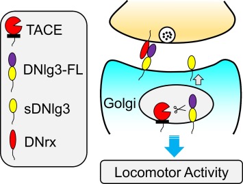 Neuroligin(Nlg)家族蛋白是一类在神经突触的形成、发育以及功能行使中具有重要作用的细胞粘附分子,其基因突变与自闭症、精神分裂症等精神类疾病相关。Nlgs蛋白翻译后加工是其成熟和功能发挥的重要环节:哺乳动物通过Nlg1的剪切调节神经活性,果蝇DNlg2的剪切是其成熟所必须。本研究揭示果蝇DNlg3加工剪切的独特机制与功能。研究发现DNlg3被剪切具有神经特异性。在体和体外实验都证明TACE蛋白酶介导DNlg3在其胞外的乙酰胆碱样结构域发生剪切,剪切产生N端片段 (NTF)和依然锚定在膜上的short DNlg3 (sDNlg3)。DNlg3剪切发生在高尔基体中,而有别于大多数膜蛋白包括小鼠Nlg1在细胞膜上才被剪切的方式。行为学分析结合遗传学方法的研究进一步揭示DNlg3剪切产生的sDNlg3对果蝇运动能力的正常维持至关重要。