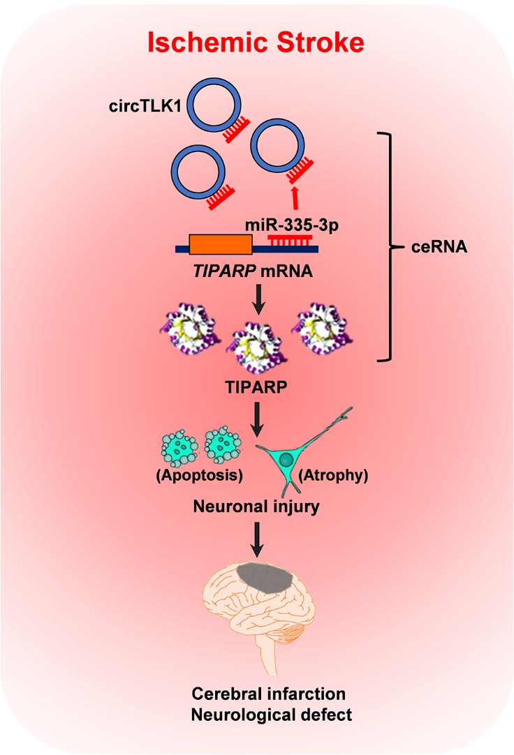 图注:circTLK1通过miR-335-3p/TIPARP途径加重缺血性中风后的神经元损伤和神经功能缺损的作用机制示意图