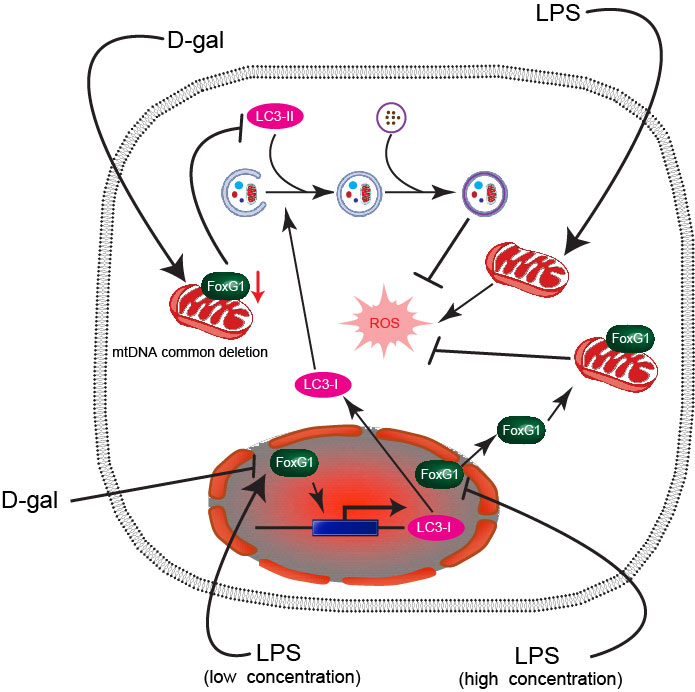图1:核转录因子FoxG1通过调控自噬途径影响内耳毛细胞在老化过程中对炎症的易感性