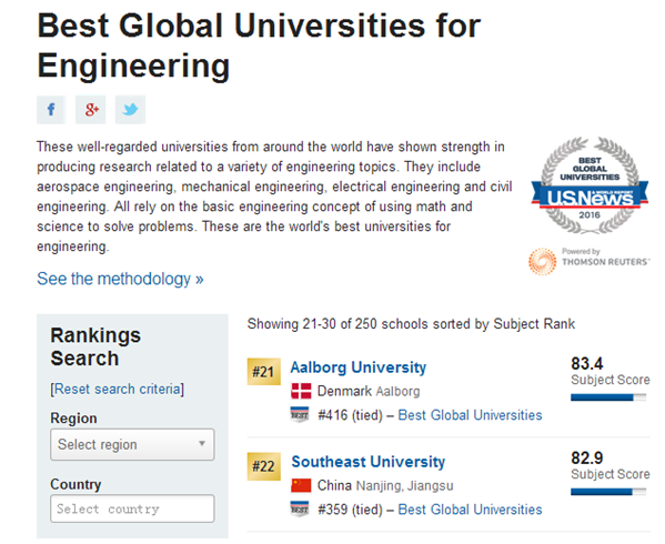 In the 2016 Best Global Universities for Engineering published by U.S. News & World Report, Tsinghua University overtakes MIT and ranks first. SEU ranks 22nd globally with the total score of 82.9(moving up by 9 positions than 2015) and 6th in Mainland China(global ranking: Tsinghua University 1st, Zhejiang University 4th, Harbin Institute of Technology 7th, Shanghai Jiao Tong University 11th, Huazhong University of Science and Technology 19th). The ranking is the outcome of comprehensive engineering analysis and takes fields such as mechanical engineering, electrical engineering and civil engineering into consideration.