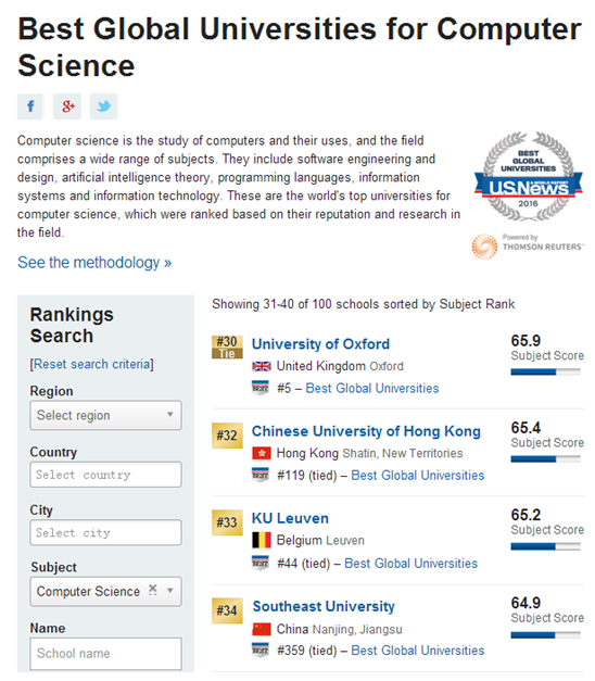 According to the published Best Global Universities for Computer Science, SEU ranks34th in the world with the total score of 64.9(moving up by 16 positions than 2015) and 5th in Mainland China(global ranking: Tsinghua University 5th, Huazhong University of Science and Technology & Shanghai Jiao Tong University 21st, Zhejiang University 23rd). The ranking is formulated after comprehensive assessment of multi-disciplinary computer science including soft engineering, artificial intelligence theory, programming languages, information systems and information technology.