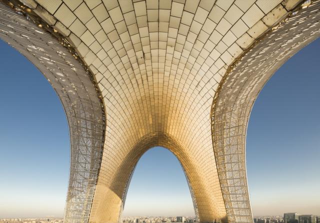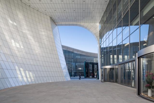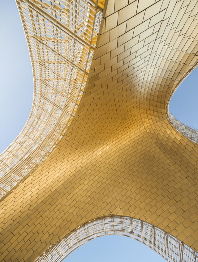 For the 3D round shapes, it is hard to find the way to make them perfect by normal materials, such as metal panels, or glasses. We use glazed terracotta (Chinese traditional materials, such as2500 years-old terracotta warriors in Xian Qin’s Emperor Mausoleum and Chinese traditional glazed roof tiles, last for thousand year but never decay for its strength and bright color. These short terracotta baguettes with different lengths and cutting angle of end surfaces weaved to fulfill the sensitive 3D curved shape. High-strength cable structure is taken to connect these baguettes. Totally, there are more than 223,000 baguettes used with the length from 650mm to 1200 mm. There is a 900 mm space between the weave terracotta baguettes and aluminum sandwich insulation panel. In this way, it is good for the temperature behavior inside the building. Air automatically flows between the double skins to have a grey protection layer. Due to air dust pollution, it is a hard job to clean the building surface. By using this meshed surface, it is automatically clean the skin by rain, and all the dusts drained into the inner flat skin and leading to the ground collecting water system for planting. Also, because the glazed terracotta is very smooth and shining, there is much less chance for the dust to stick on comparing with normal metal materials.