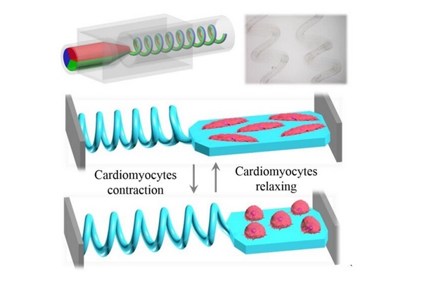 The organ chip, which is to build biomimetic micro-organs on chips to replace the organism, is used for drug evaluation and biological research. The construction of cardiac chip with myocardial cell mechnics is an important part of organ chip development. The research team proposed to use a helical fiber structure as mechanical sensors for cardiomyocytes. The helical structure, which is the best existence form in a limited space, is one of the most common forms in nature. It is represented in the storage of genetic information -- DNA, plant vines climbing in other objects and the spring. Inspired by this, scientists have developed a series of helical fibers for microelectromechanical systems (MEMS), optical sensing, and etc. However, due to the limitations of the means of preparation, the reports about biomimetic helical microfibers, especially biologically responsive ones, are zero.