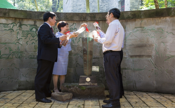 At the end of the ceremony, the leaders of the two schools unveiled the “Guanghua Column”, and sealed the soil of the Westward road in it. “Guanghua Column” was designed by Professor Zhang Zhixian from the School of Arts, SEU. It’s 115 cm high, meaning the 115th anniversary of SEU. The body was triangular pyramid shape, inspired by the National Central University’s triangle school badge. The top of the cover was engraved with the road map of the Westward, and the bottom was engraved the school badge of National Central University. The foundation bed was the school badge of Southeast University. The overall shape looked like a torch, meaning inheritance and hoping the spirit of the predecessor could shine the way of today’s students.