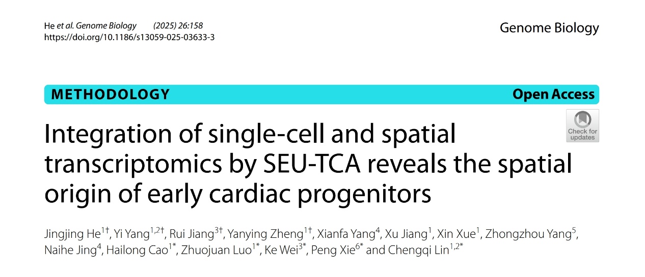 On June 10, 2025, the team of Professor Lin Chengqi and Professor Luo Zhuojuan from the School of Life Science and Technology, and Research Professor Xie Peng from the School of Biological Science and Medical Engineering, in collaboration with several research institutions, published a research paper in the journal Genome Biology titled, "Integration of single-cell and spatial transcriptomics by SEU-TCA reveals the spatial origin of early cardiac progenitors." The paper introduces a novel integrative analysis tool for spatial transcriptomics—SEU-TCA (Spatial ExpressionUtility - Transfer Component Analysis)—which deciphers the "spatial information code" of cardiac progenitors and systematically reveals spatial subtypes of second heart field progenitor cells.