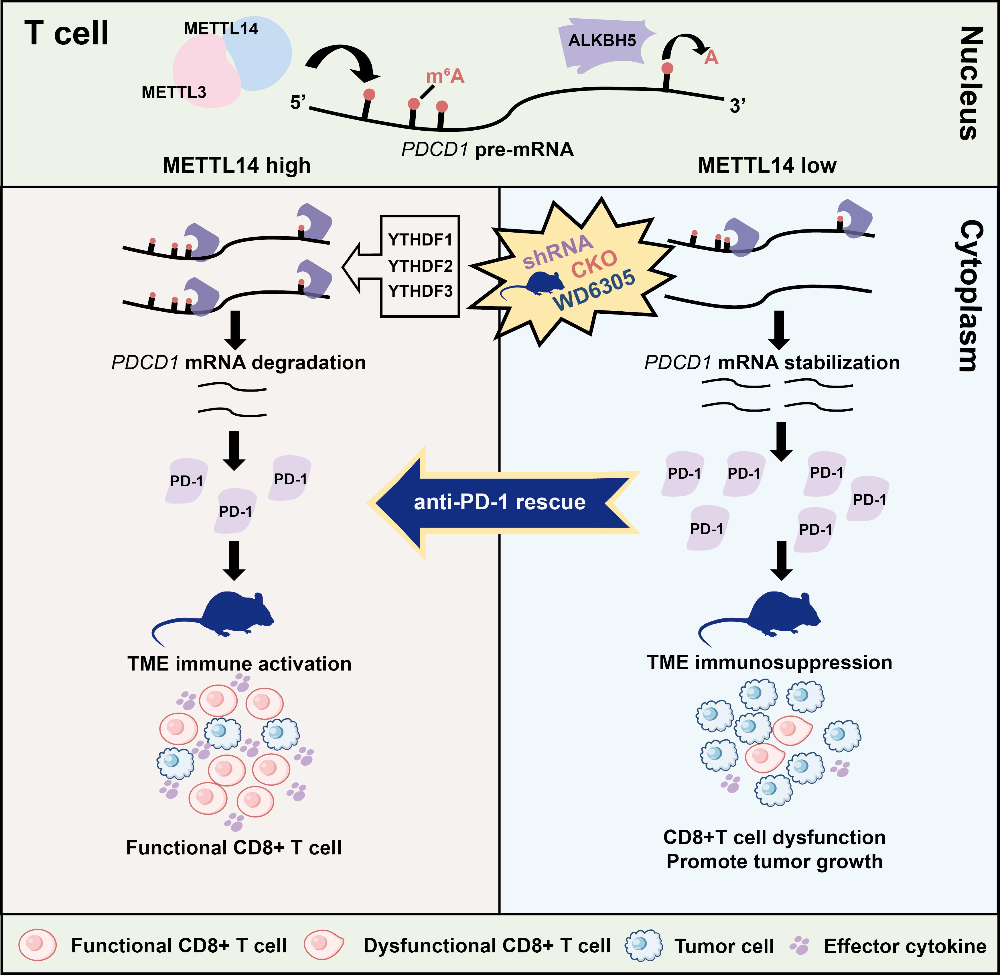 In summary, this work reveals an m6A-dependent regulatory mechanism for PDCD1 in T cells and demonstrates the critical role of the METTL14–PD-1 axis in anti-tumor immunity. These findings offer novel perspectives for developing T cell-targeted immunotherapeutic strategies.