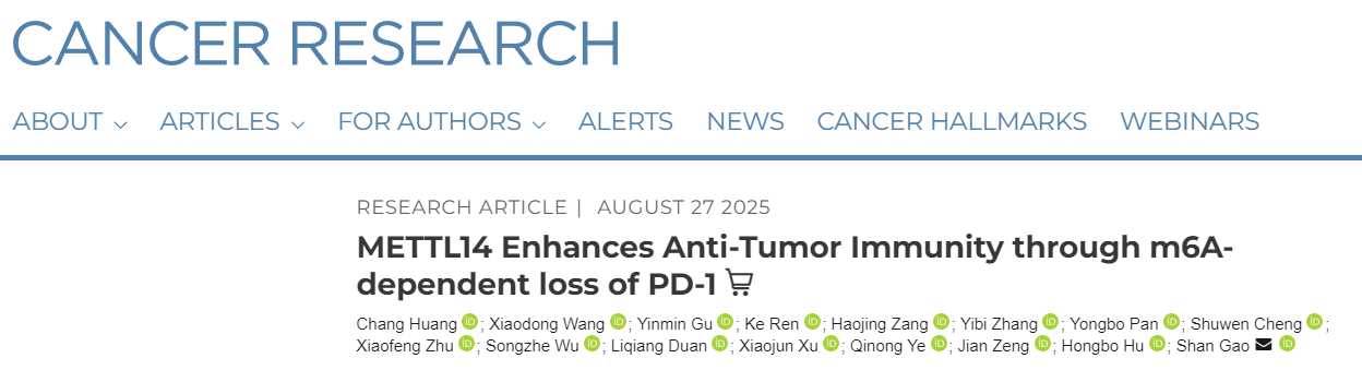 Recently, a team led by Professor Shan Gao published a research paper titled METTL14 Enhances Anti-Tumor Immunity through m6A-dependent loss of PD-1 online in Cancer Research, providing a new theoretical basis and therapeutic strategy for improving cancer immunotherapy.